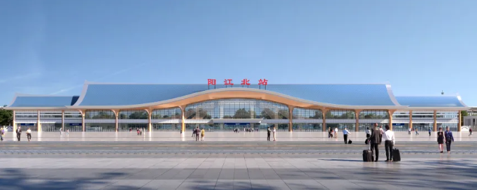 阳江北站位于阳江市江城区。阳江北站设计以阳江得天独厚的滨海地域文化内核为概念源泉,用现代的建筑手法表现“海纳百川、缘结四海”的江海精神内核以及独具特色的岭南城市的文化情怀。