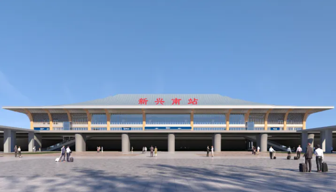 新兴南站位于云浮市新兴县。站房整体造型基于新兴当地岭南文化与广府文化的传统建筑形式,整体框架采用暖灰色铝板,体现传统与现代相结合的建筑意向。天际线丰富的屋顶及有层次的檐口汲取了传统唐式大殿的脊线,既突出了建筑的层次感,又彰显站房的简洁大气。屋檐下的立柱与竖向金属格栅呼应当地传统建筑的立面意向。